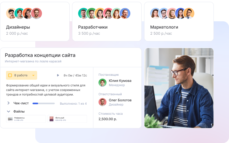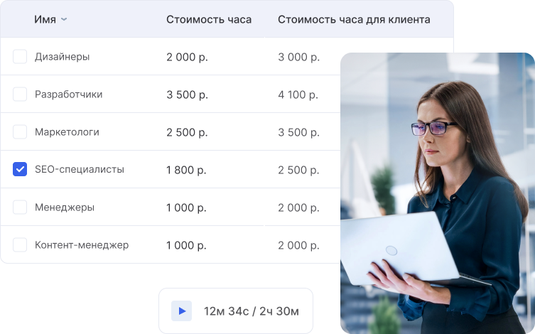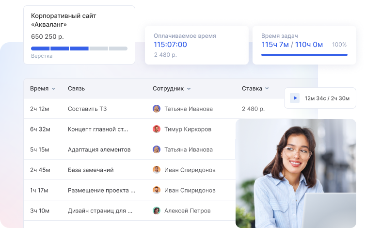 Достаточно задать плановое время задачи и стоимость часа для сотрудников. Аспро.Cloud сразу начнет фиксировать фактическое время, сравнивать его с планом и строить аналитические отчеты.