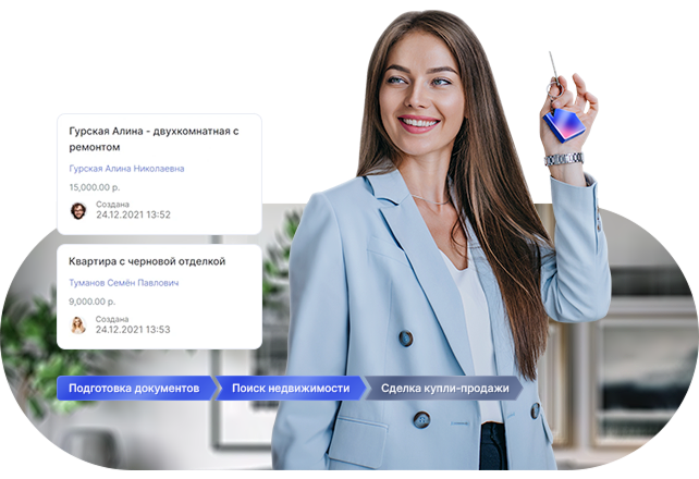 Проектом может быть любая долгосрочная сделка. Например, для ипотечных сделок или для оформления коммерческих объектов, когда требуется подготовка большого пакета документов. Настройте этапы: Подготовить пакет документов для ипотеки → Провести сделку купли-продажи → Получение зарегистрированных документов и расчет.