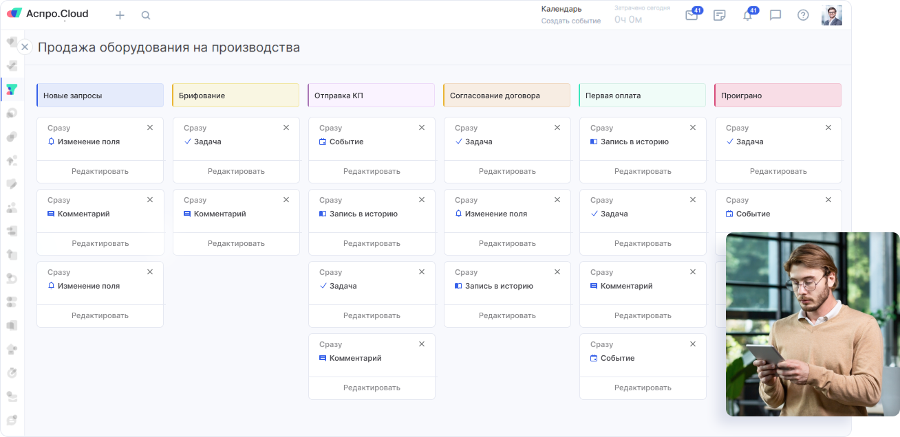 Аспро.Cloud — надежная CRM для b2b-продаж. В этой сфере система особенно важна, так как от правильной работы с клиентом зависит успех в крупных сделках. Вам необходимо выстроить качественное взаимодействие с вашими b2b-клиентами, иметь по ним полные данные и помнить о всех сделках и проектах.