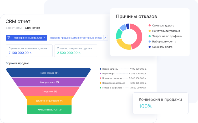 Аспро.Cloud предоставляет все инструменты для контроля отдела продаж. Отследите каждую сделку на kanban-доске, настройте напоминания для менеджеров и определите причины отказов по каждой сделке. Ведь в b2b каждый плохо обработанный лид может обойтись очень дорого.