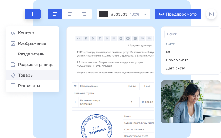 Одних счетов недостаточно для работы в b2b. Договоры, коммерческие предложения, заявления — любой документ можно собрать с помощью конструктора в Аспро.Cloud. Оформите шаблоны под свой корпоративный стиль, задайте переменные, например, реквизиты контрагента, а система подставит их автоматически.