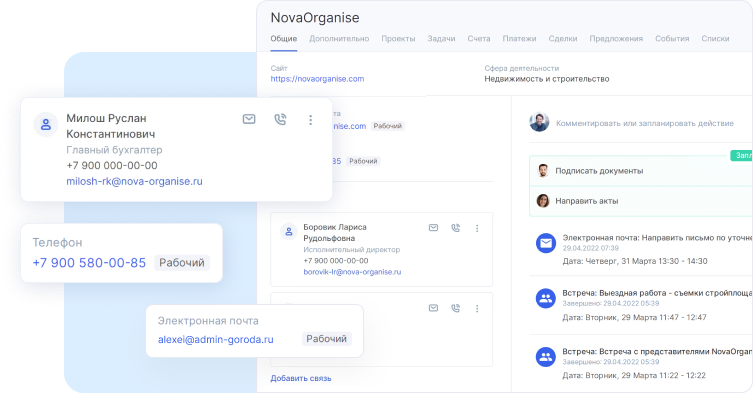 Работайте с клиентской базой эффективно. Аспро.Cloud не только сохранит всю информацию о контрагенте, но и поможет навести в ней порядок. Объедините контакты нескольких представителей заказчика в карточку компании и укажите их должности, чтобы эффективно использовать CRM для работы с клиентами b2b.
