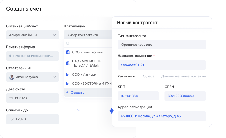 Достаточно выбрать шаблон счета и товары: система сама заполнит информацию о контрагенте и рассчитает стоимость. Благодаря интеграции с платежными системами можно выслать ссылку на счет, чтобы клиент оплатил его онлайн. Также Аспро.Cloud отследит статус оплаты каждого инвойса и отправит его повторно, если средства долго не поступают.