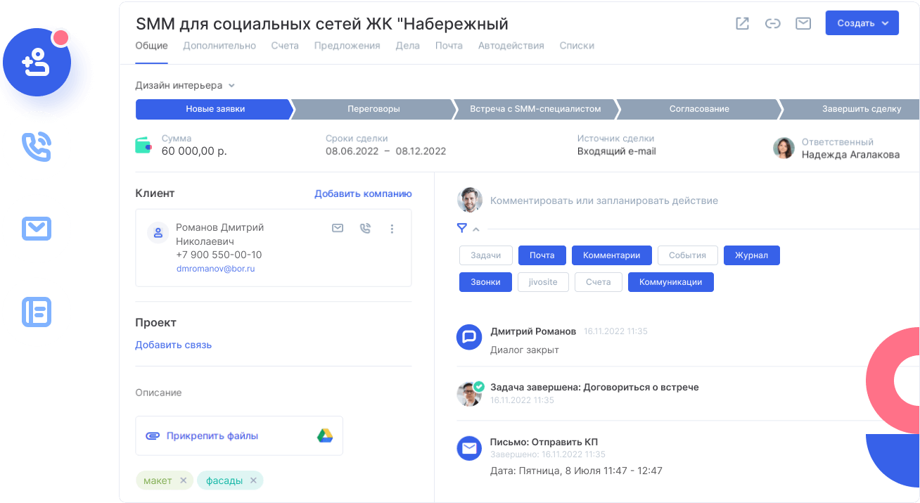 Аспро.Cloud фиксирует все обращения с сайта, рекламы и звонков, поэтому ни один лид не теряется. Система показывает этапы сделки, напоминает менеджеру о звонках и встречах, помогает назначать тест-драйвы и запускать персональные предложения. Это повышает конверсию и ускоряет цикл продаж.