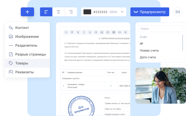 Франшизное соглашение, договоры с поставщиками, лицензии на торговлю и разрешения — документы, которые необходимы при продаже франшизы. Любой из них можно подготовить с помощью конструктора в Аспро.Cloud. Добавляйте необходимые блоки и используйте корпоративный стиль. Чтобы не ошибиться в данных покупателя, задайте переменные, и система автоматически подставит информацию из карточки контрагента. А шаблоны документов помогут быстрее заключать сделку.