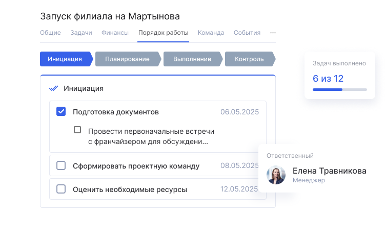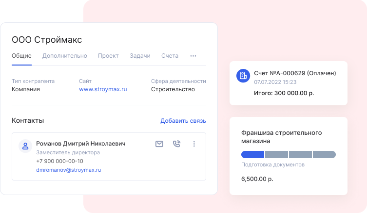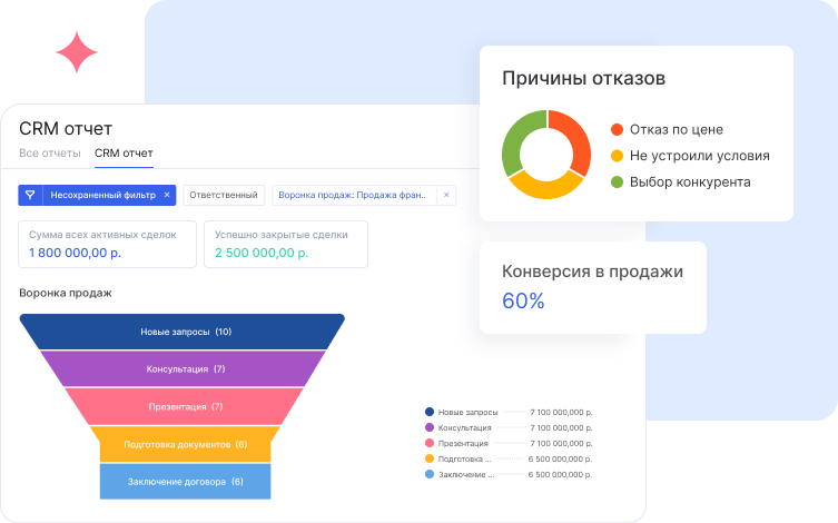 CRM-система соберет лиды потенциальных франчайзи с вашего сайта, электронной почты и социальных сетей, чтобы не терять заявки и быстро обрабатывать их. Продумайте этапы воронки продаж и отслеживайте на kanban-доске путь клиента от заявки до заключения договора. А CRM-отчет покажет причины отказов и общую конверсию, чтобы вы смогли выявить эффективные стратегии и вовремя скорректировать работу.