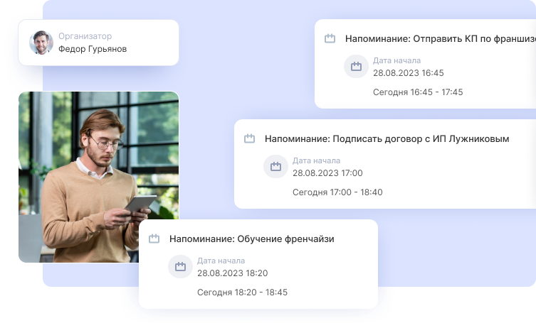 Когда менеджер невовремя отправляет документы или забывает перезвонить, клиент может передумать заключать сделку. Используйте автодействия, чтобы система сделала то, что человек забудет. Задайте условия, а сервис автоматически запланирует встречу, созвон с клиентом или отправит электронное письмо. А чтобы вы не забыли о предстоящих событиях, Аспро.Cloud заранее отправит напоминание.