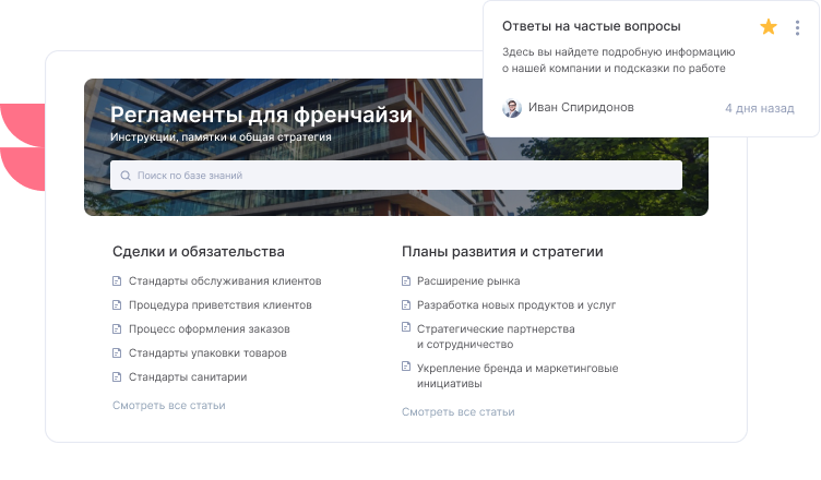 Чтобы сохранить репутацию компании, все франчайзи должны знать стандарты и правила работы компании. Для этого создайте базу знаний в Аспро.Cloud и добавьте в нее необходимые инструкции и руководства. Это позволит вам мгновенно делиться материалами с покупателями франшизы после ее приобретения и избегать конфликтов и недопониманий.