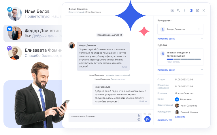 Соберите заявки из мессенджеров, соцсетей, email и телефонии в едином рабочем пространстве. Менеджер расскажет про клининговые услуги и вовремя ответит на каждую заявку в удобном для заказчика канале. CRM создаст карточку клиента и сохранит историю переписки. Используйте точки контакта по максимуму с Аспро.Cloud.