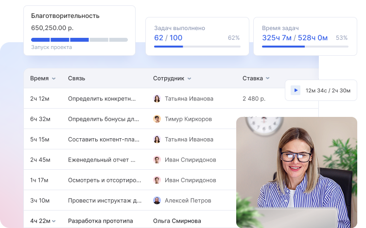 В системе есть тайм-трекер для учета времени работы волонтеров. Это упрощает подготовку отчетов и мотивацию самых активных помощников.