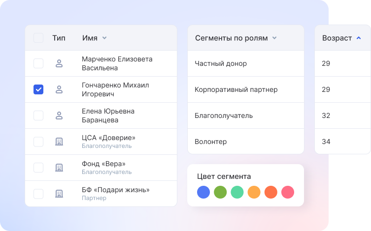 В CRM для благотворительных фондов есть возможность создать единую базу всех жертвователей и сегментировать их. Также можно настраивать персонализированные рассылки благодарностей, новостей или отчетов по сегментам прямо из системы.