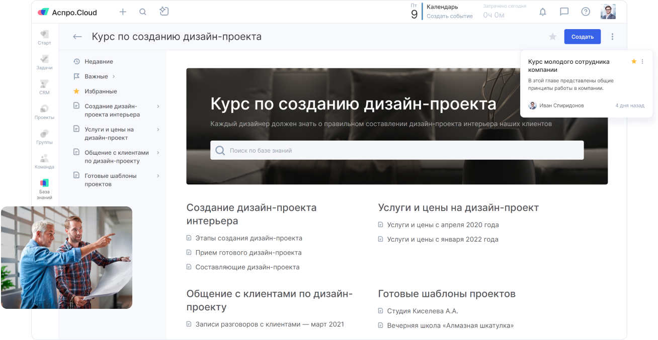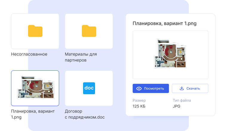 В Аспро.Cloud у каждого проекта есть своя карточка, где хранятся все документы: договоры, сметы, чертежи, отчеты. Доступ разграничивается по ролям, поэтому сотрудники видят только нужные файлы. Это исключает потерю документов и экономит время на поиске.