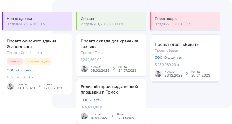 Выстройте эффективные продажи с Аспро.Cloud. Соберите заявки, проведите переговоры и пройдите через все этапы согласования на пути к успешному проекту. CRM-система поможет предоставить качественный сервис и построить долгосрочное сотрудничество с клиентами.