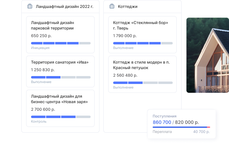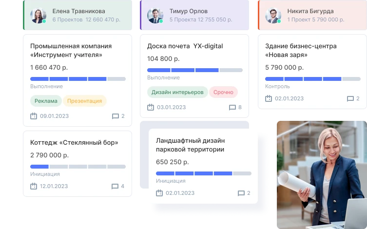 Не знаете, можете ли взять нового клиента? Просто взгляните в систему. Аспро.Cloud покажет нагрузку каждого менеджера и завершенность их проектов. Вам больше не придется обзванивать руководителей, чтобы узнать, насколько заняты команды.