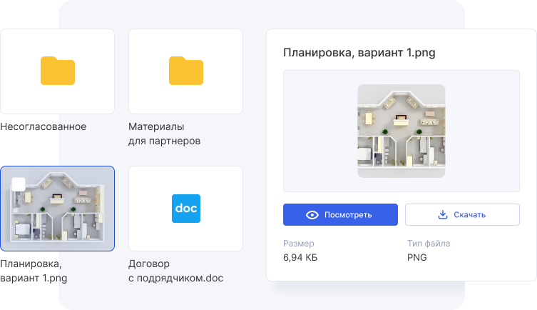 Команде в любой момент может потребоваться доступ к важной информации: договору с подрядчиком, кадастровому плану земельного участка, макету от дизайнеров. Аспро.Cloud помогает хранить всю документацию в одном месте. Сохраните важные файлы, чтобы иметь к ним моментальный доступ даже со смартфона.