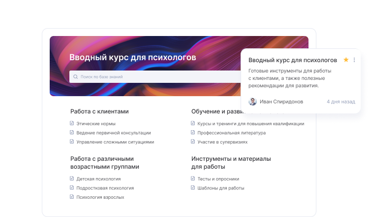 Корпоративная база знаний в Аспро.Cloud — надежный источник профессиональных знаний. Соберите в одном месте принципы работы с клиентами и лучшие практики, а также готовые материалы и рекомендации. Благодаря понятному редактору поделиться опытом и наработками сможет любой сотрудник. Так специалистам будет легче готовиться к сессиям и эффективно решать даже критические ситуации, а вы будете уверены в качестве каждой консультации.