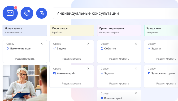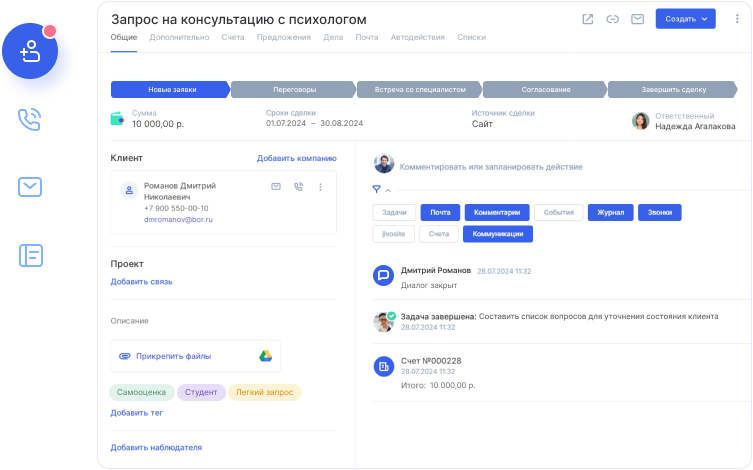 Автоматизируйте рутину, фиксируйте историю взаимодействий с клиентом и управляйте расписанием в одной системе. Уделяйте время тому, что действительно важно — заботе о ваших клиентах.