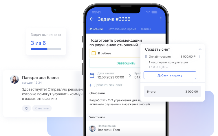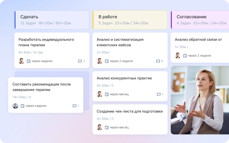 Чтобы не забыть составить план работы или подготовить упражнения к следующей консультации с клиентом, просто создайте задачу. Установите дедлайн, приоритет и при необходимости добавьте коллег. Контролировать статус выполнения вы сможете на канбан-доске, в режиме «Планирование» или списке задач. А чтобы сэкономить время на постановке повторяющихся дел, создайте регулярные задачи. Так вы сможете эффективнее выстраивать свою работу и точно ни о чем не забыть.