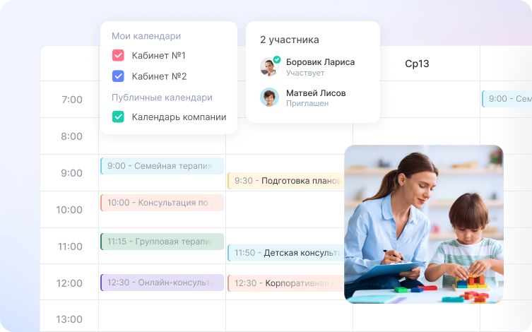 Чтобы консультации не накладывались друг на друга, ведите график во встроенном календаре.Так вы сможете следить за расписанием на день, быстро находить свободные окна для новых записей и всегда видеть, кто записан на сеанс. Создайте отдельные календари под каждую рабочую зону, чтобы избежать ситуаций, когда один и тот кабинет бронируют несколько специалистов одновременно.