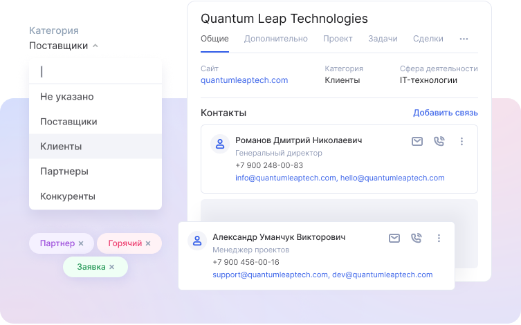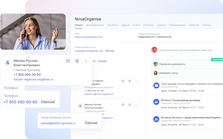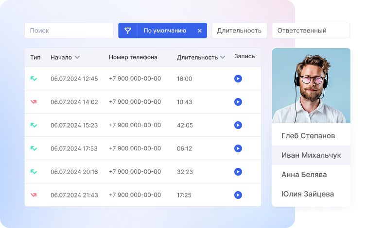 CRM-система сохранит все разговоры с клиентами, чтобы у агента всегда был доступ к важной информации. При входящем звонке система автоматически распознает контрагента из базы и покажет его карточку. Так агент сможет быстро решить вопрос клиента и отправить нужные документы.