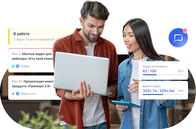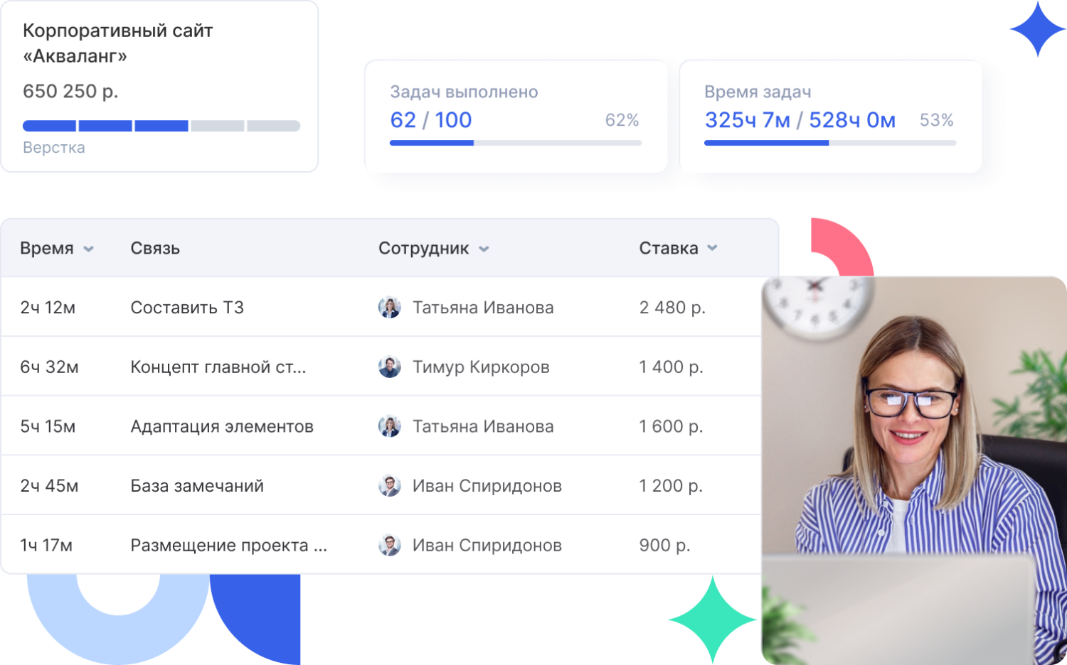 В работе веб-студии важно полное взаимодействие между отделами команды. Поэтому в Аспро.Cloud рабочее пространство максимально прозрачное. Верстальщики, дизайнеры, программисты могут следить за процессом и продуктивностью друг друга. Это поможет скорректировать работу на предварительных этапах и проводить анализ эффективности компании.