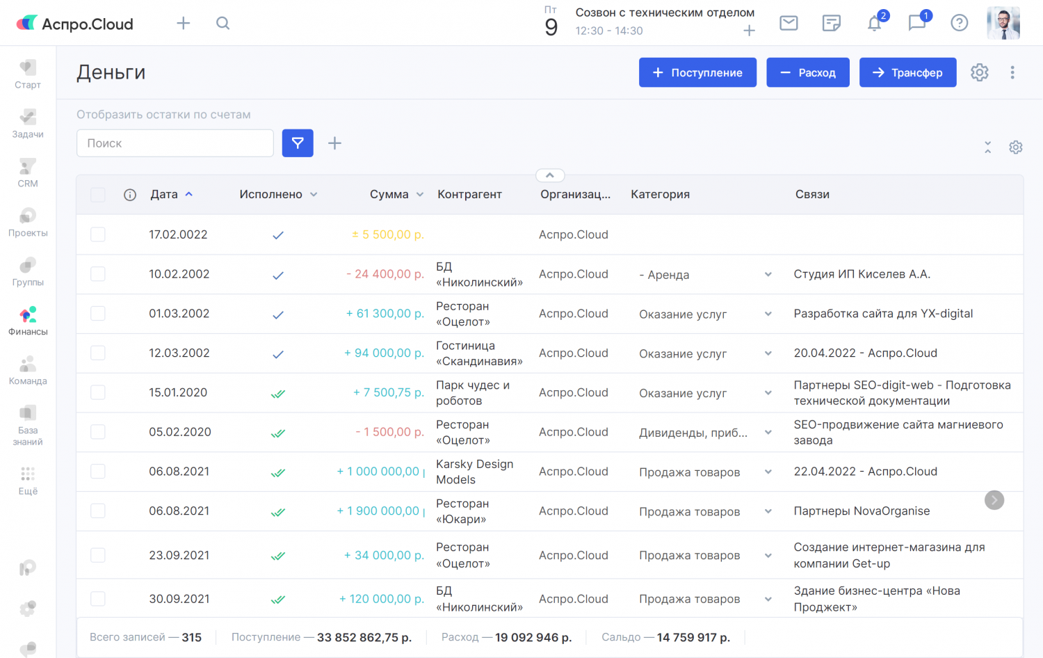 Аспро.Cloud интегрирован с крупными банками для возможности следить за денежными переводами в любое время. Просмотр суммы по поступлениям и затратам будет доступен за любой период и посмотреть его можно из списка с платежами. Проверяйте остатки на банковском счете и отслеживайте финансовые операции в режиме единого окна.