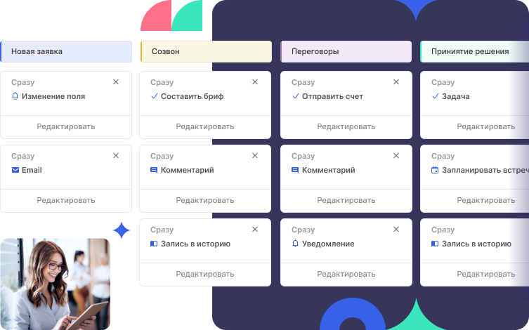 CRM-система Аспро.Cloud автоматически соберет поступающие лиды, сформирует сделку, задачу или отправит оповещение по выстроенным условиям. Это избавит от рутинных действий в работе и поможет сделать процесс оперативным. CRM-система самостоятельно переведет сделку на следующий этап, а также вышлет руководителю уведомление о возникновении проблемы. Все показатели вы сможете посмотреть в подробных отчетах.