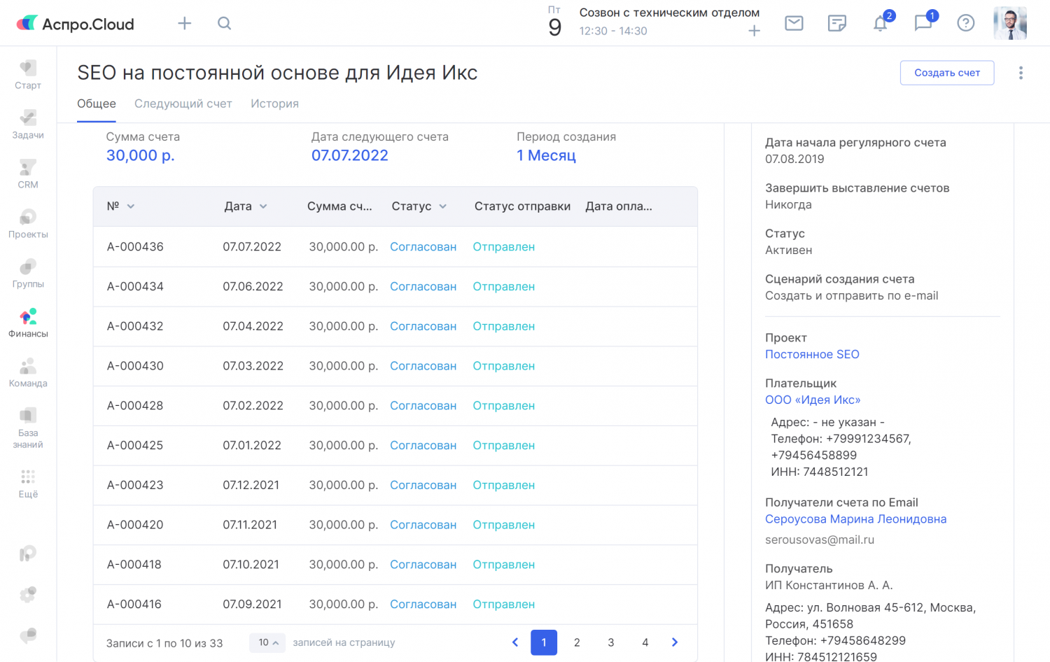 CRM-система автоматизирует отправку счетов в работе веб-студии. Теперь документ об обслуживании пользователя по рекламе или поддержки сайта будет оперативно выслан клиенту. Платформа самостоятельно выставить счет и отправит его контрагенту по email. Вы избавитесь от рутинных действий и будете отслеживать поступление оплаты от контрагентов.