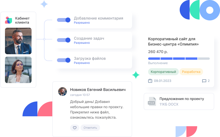 Некоторые клиенты хотят видеть процесс работы и корректировать этапы совместно с командой. Предоставьте внешний доступ для контрагентов, чтобы показать прозрачную картину работы, клиент всегда будет знать какая задача и на каком этапе. Это повысит уровень лояльности и доверия по отношению к вашей компании. Просто предоставьте доступ по ссылке и приглашенный пользователь может ставить задачи, формировать предложения и счета и сразу произвести оплату. Подключайте к делам веб-студии партнеров, фрилансеров и работайте над проектами совместно.