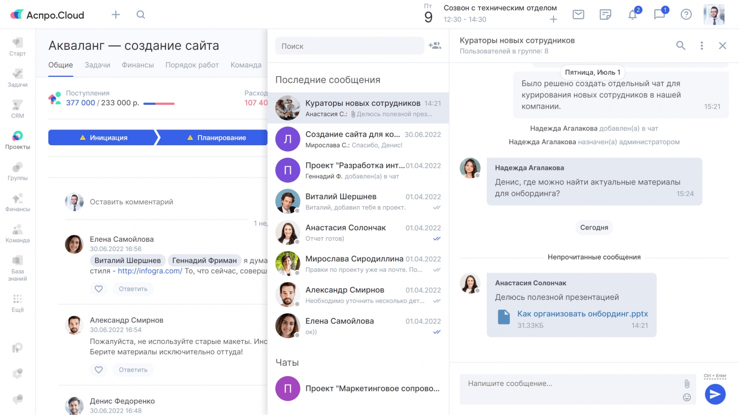 Дополнительные инструменты в CRM-системе Аспро.Cloud помогут организовать совместную работу веб-студии. Создание ментальных карт для визуализации идей и выстраивания схем задач или проектов, а также внутренний мессенджер для взаимодействия команды в групповом чате. Давайте обратную связь в комментариях к проектам, задачам или сделкам и координируйте процесс вместе с коллегами.