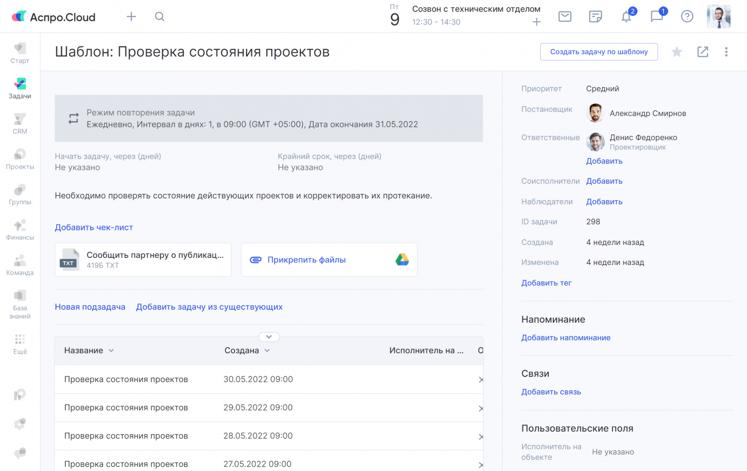 В любой даже самой творческой работе есть рутина. Оплатить офис веб-студии, закупить канцелярию — все это отнимает время на постановку тасков и отслеживание их выполнения. В CRM-системе Аспро.Cloud можно автоматизировать создание однотипных задач. Тогда таск будет возникать по заданному вами интервалу и с заранее определенным ответственным менеджером.
