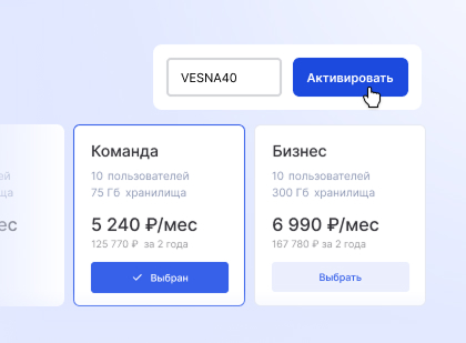 Промокод VESNA40 работает на тарифы «Старт», «Команда», «Бизнес», «Корпорация 100», «Корпорация 200» и «Корпорация 300» при покупке на 12 месяцев.