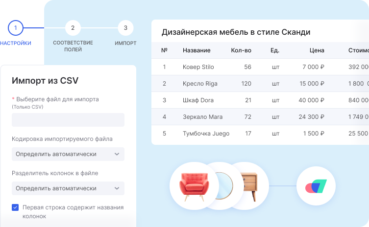 Ваши товары и текущие остатки можно легко загрузить в Аспро.Cloud. Готовить файл к импорту не нужно: интерфейс системы поможет легко настроить соответствие полей.