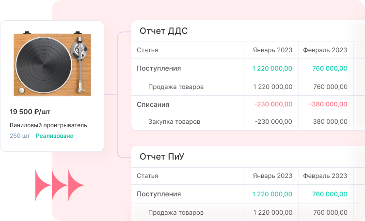 Отслеживать товары — это важно, но конечный результат всегда измеряется деньгами. С Аспро.Cloud вы сможете контролировать финансы, связанные с товарами, двумя методами: кассовым и начисления. Отчет ДДС покажет поступление и списание средств со счетов, а ПиУ — стоимость отгруженных товаров и себестоимость.