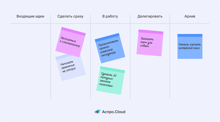 Если вы цените визуализацию, для системы ГТД можно использовать физические канбан-доски. Доску для заметок нужно разделить на колонки. Все новые задачи будут попадать в первый столбец, а потом во время структуризации распределяться по остальным колонкам.