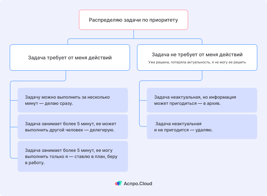 На этом этапе системы GTD удобно использовать таск-трекер. Например, в Аспро.Cloud можно:- расставлять приоритеты;