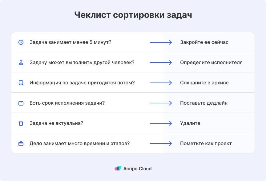 Если сомневаетесь в систематизации, можно прогнать задачи по чеклисту методики GTD: