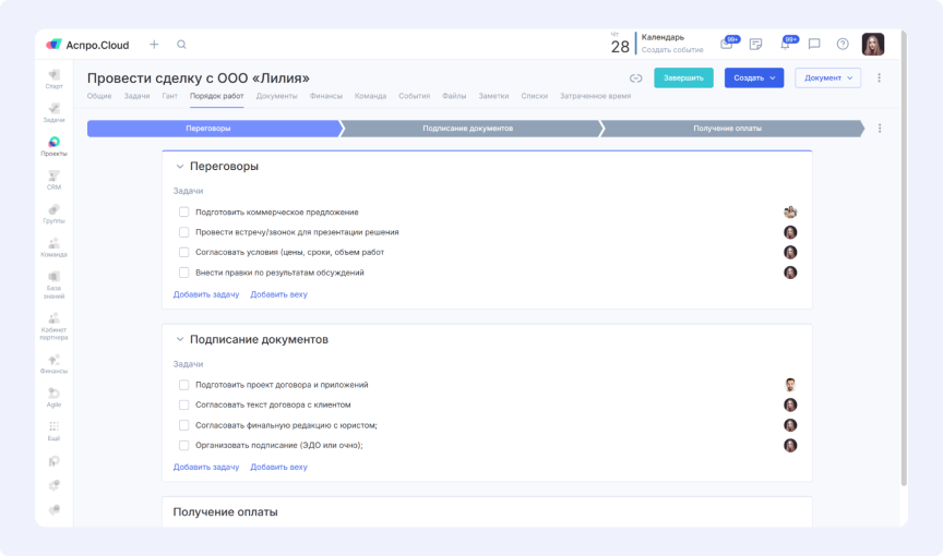 Каждый шаг — этап проекта. Тут можно поступить так: провести самостоятельно переговоры, подготовку и подписание договора поставить на менеджера, а прием оплаты — на бухгалтера.