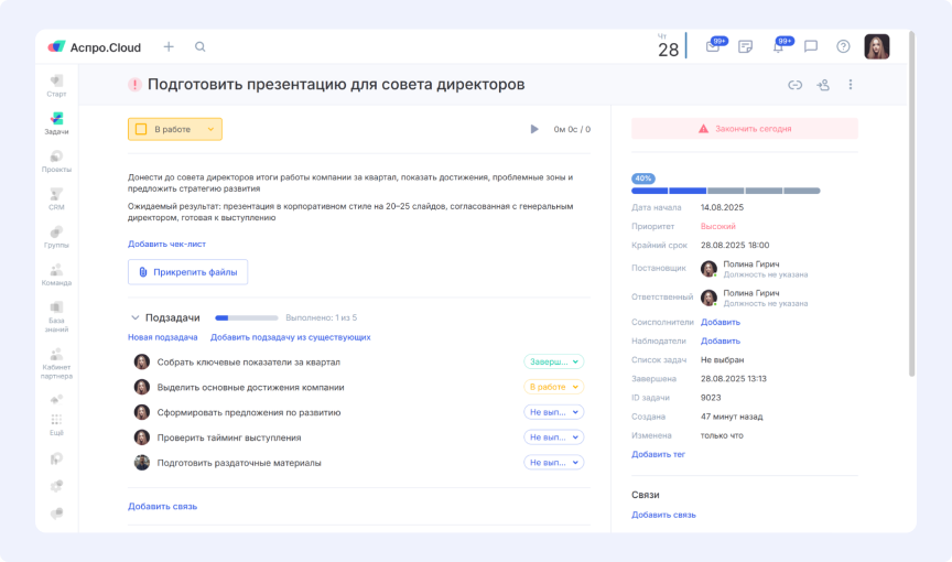 К примеру, встреча с клиентом — в среду. Но на переговорах понадобится презентация и финансовый отчет за последние полгода. Документы нужно подготовить заранее, поэтому стоит поставить задачу на вторник. В Аспро.Cloud вы можете создавать подзадачи. Каждая из них — отдельная сущность со своими сроками и ответственными.