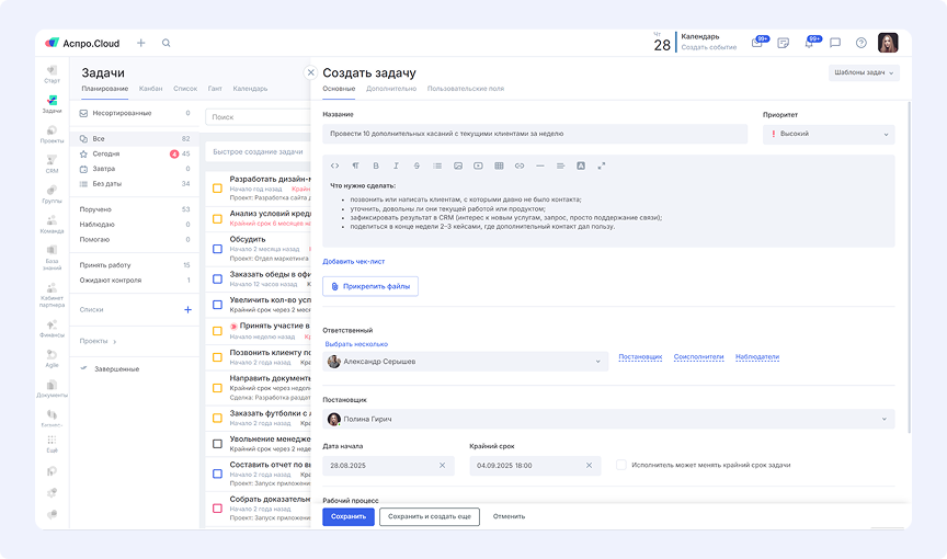 Аспро.Cloud также позволяет удобно планировать проекты. Пропишите необходимые этапы и задачи и отслеживаете прогресс. При необходимости вы сможете погрузиться в поручение прямо из карточки проекта. Например, если нужно сдвинуть сроки или сменить ответственного.