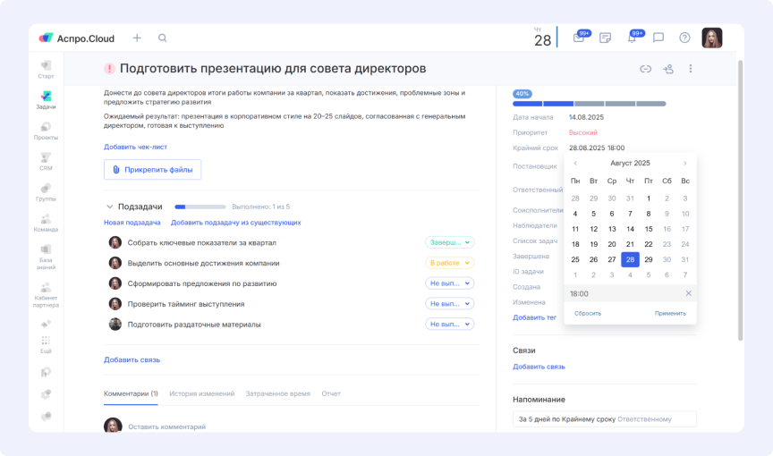 В Аспро.Cloud можно поставить дедлайн внутри задачи. А чтобы вы точно ничего не пропустили, система автоматически отправит напоминание.