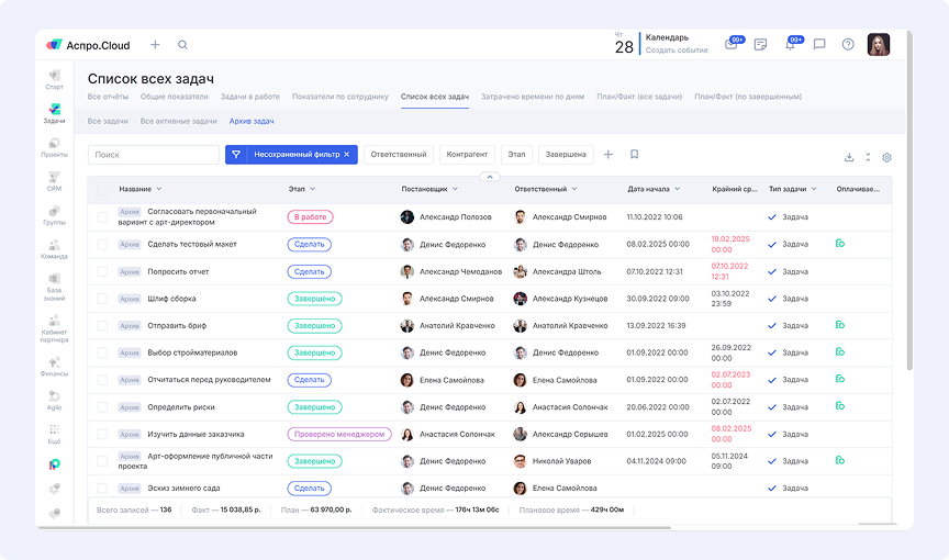 В Аспро.Cloud отправить задачу в архив можно в один клик. Вернуть ее в работу также быстро. При этом у вас сохранится вся информация для работы и история изменений.