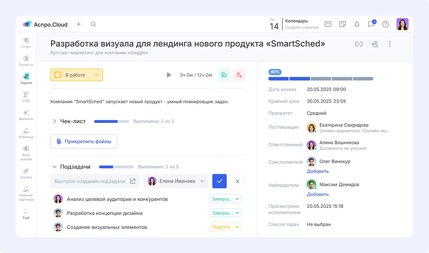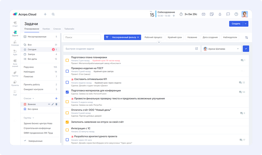 Пример таск-менеджера — облачная система Аспро.Cloud. Сервис позволяет не просто ставить задачи, а структурировать планы на день и держать фокус на важных делах. В системе видно, какие задачи «горят» сегодня, какие запланированы на завтра, а какие просрочены. Также можно ставить задачи коллегам, отслеживать их выполнение и корректировать план работ.