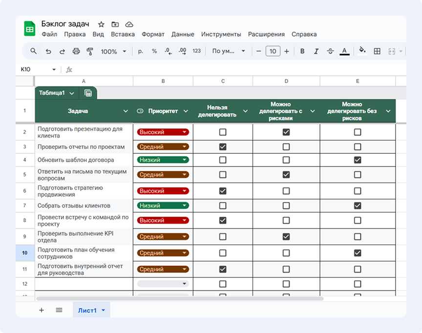 Сначала нужно оцифровать хаос. Мы садимся и создаем Google-таблицу, где расставляем приоритеты: высокий, средний и низкий. Для руководителей добавляем столбцы: нельзя делегировать, можно делегировать с рисками и без рисков.