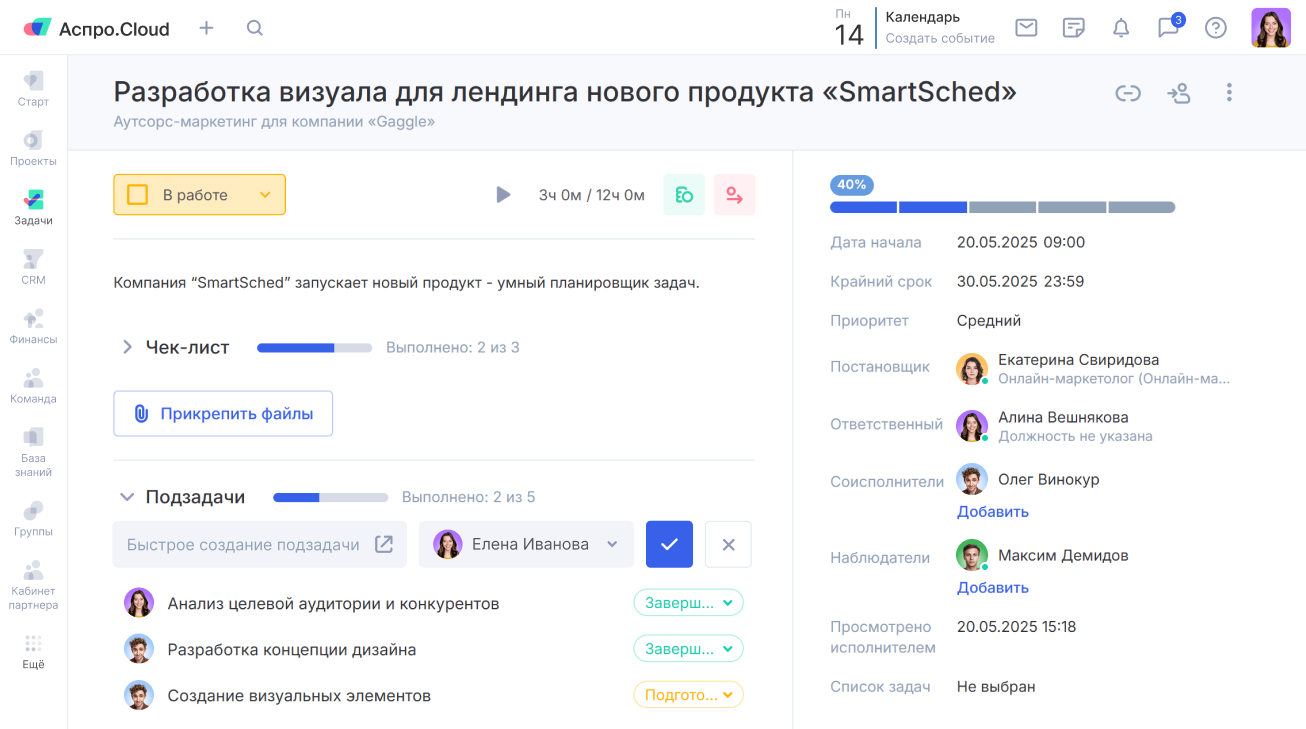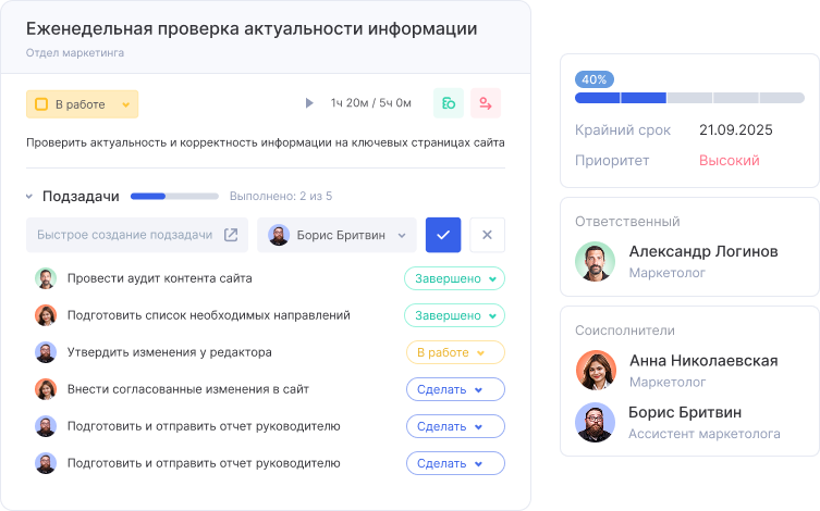 Когда поручение слишком большое, работа буксует. Исполнители не понимают, с чего начать. А руководителю сложно отследить прогресс. Чтобы выстроить эффективную работу, создайте подзадачи и укажите для каждой исполнителей, сроки и приоритеты. Команда получает четкий план действий, а вы — полный контроль над процессом.