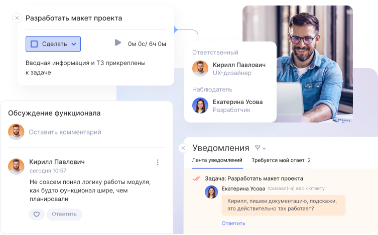 В Аспро.Cloud каждый сотрудник понимает свою зону ответственности. Создавайте карточки задач для компании, назначайте ответственных, исполнителей и наблюдателей. Так все специалисты смогут отслеживать историю изменений и вовремя подключаться к рабочему процессу. А чтобы не тратить время на уточнения, общайтесь прямо в карточке: комментируйте и призывайте коллег к ответу, если нужен быстрый отклик.