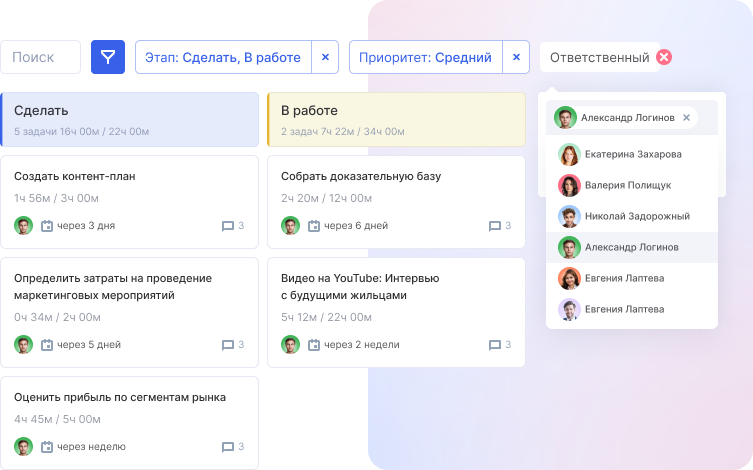 Вы сами решаете, какие этапы проходят карточки задач CRM. Хотите добавить «На согласовании» или «Ожидает материалов»? Пожалуйста. Система подстраивается под ваш рабочий процесс, а не наоборот. Гибкие статусы задач помогают увидеть, где находится поручение, и что мешает его завершению. А если заданий становится слишком много, примените теги и фильтры по ответственному или дедлайну.