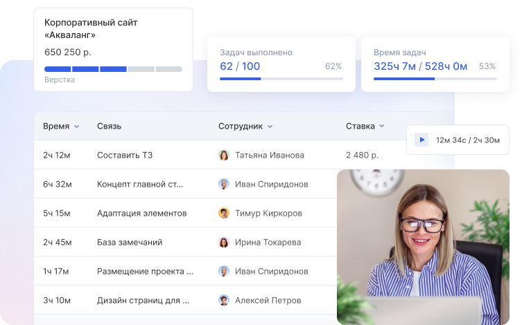 С Аспро.Cloud каждая минута на счету. Сотрудники фиксируют затраченное время прямо внутри карточки задач CRM, а вы — контролируете загрузку и понимаете, на что уходит рабочий день. Это помогает вовремя заметить переработки и скорректировать процессы. А чтобы управлять бюджетом, установите ставку для каждого специалиста. Система автоматически рассчитает стоимость заданий по планируемому или фактическому времени.