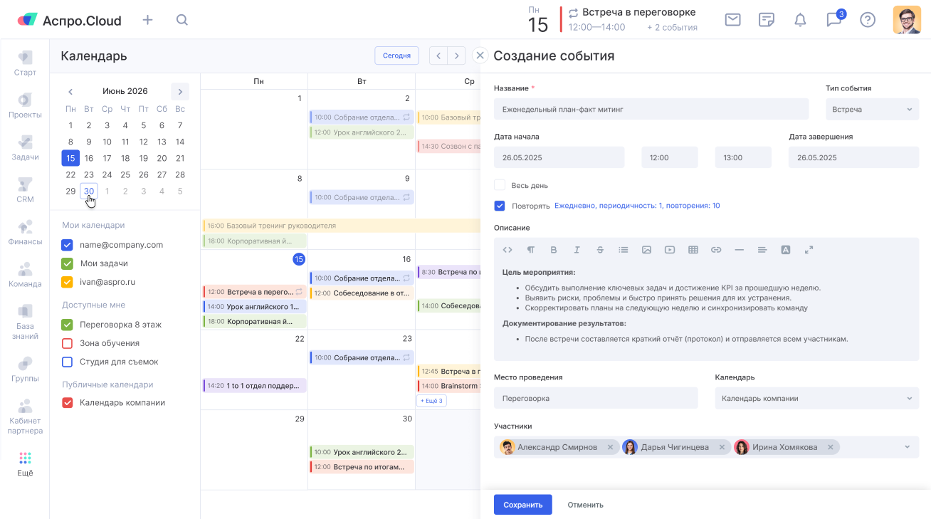 Да! Периодические события сервис Аспро.Cloud позволяет легко настраивать благодаря интуитивно понятному интерфейсу. Все, что от вас требуется, — один раз создать шаблоны событий и установить периодичность. Дальше всю работу сделает за вас система.