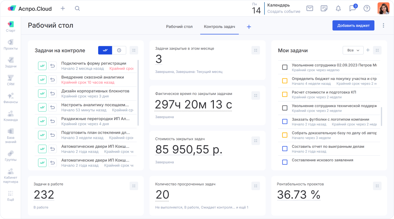 Используйте фильтрацию по участникам, проектам и статусам, чтобы видеть результат по каждому блоку. В виджете также отображается время, потраченное на задачу, и её текущий статус.